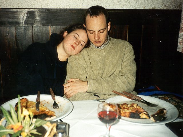 After this stint at the bar, the stomachs began to rumble, so Doug and Liz led an expedition to find last year's pizzaria. Eryl's preoccupation with trying to lift boulders of snow and ice also became evident at this point!"