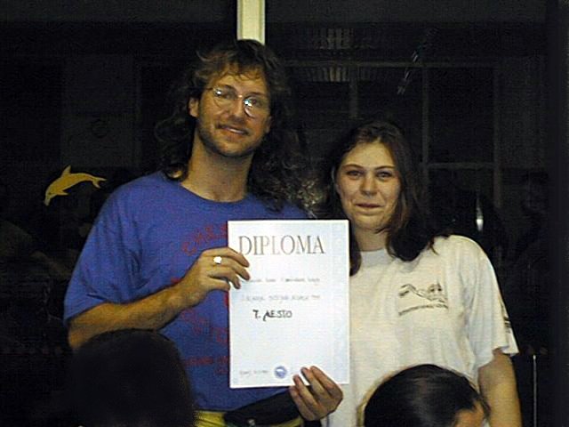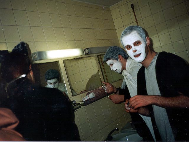 Sara: "We all awoke about 7.30 as we wanted to get to breakfast early (we learned *that* from last year!). Sara arrived in the bathroom to see Culvin trying to make himself presentable and unsmelly, after a nightmare train trip all the way from Lithuania. He had arrived at about half past five that morning, got a key to one of our empty rooms from the night-watchman and gone straight to bed. He promptly bought a T-shirt from Sara, as he had no other clean clothes! At last the team was complete!