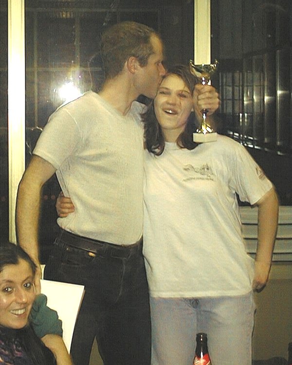 After the tournament we all headed to the bar and hall for a meal of pasta, meat and cheese sauce - a great improvement on last year. Sara was in T-shirt selling mode as she was trying to offload the remaining tour shirts. Rob attempted to help her out by hawking, but as more than half the room probably didn't speak English, much less Somerset, his effort were lost to most! At this point Helen got a bit of a surprise from Paul, with the presentation of "something for the weekend".
